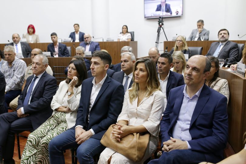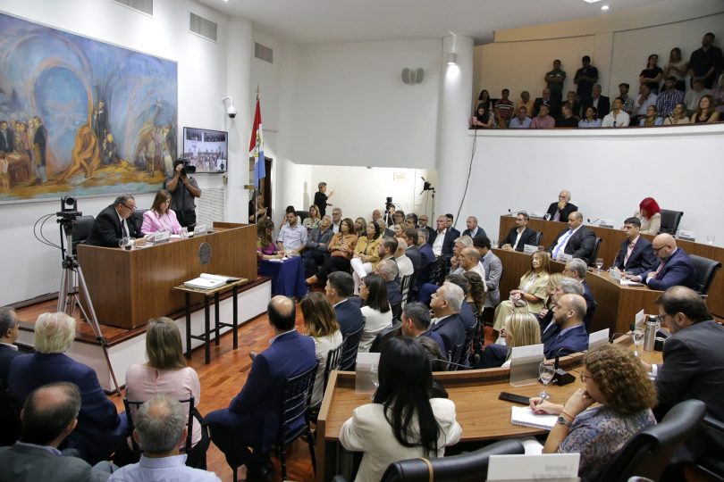 La presidenta del Deliberativo local, Adriana “Chuchi” Molina, junto a los vicepresidentes Jorgelina Mudallel y Lucas Simoniello, fueron los encargados de recibir al mandatario local en la sala Zapata Gollán y acompañarlo hasta el estrado, donde lo aguardaban el resto de los concejales, autoridades municipales, provinciales, legislativas y público en general.